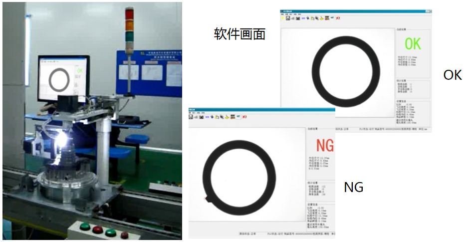 “密封圈缺陷視覺檢測系統(tǒng)”針對(duì)密封圈質(zhì)量(邊緣缺口毛刺、內(nèi)外徑尺寸)進(jìn)行檢測。相機(jī)快速采集生產(chǎn)線上密封圈圖像,將圖像數(shù)據(jù)傳送到圖像處理系統(tǒng),圖像處理系統(tǒng)對(duì)每幅圖像進(jìn)行預(yù)處理、尺寸測量等運(yùn)算,通過與標(biāo)準(zhǔn)模板圖像及設(shè)定參數(shù)進(jìn)行比較,來判斷產(chǎn)品是否合格,輸出廢品報(bào)警信息及剔廢控制信號(hào),由機(jī)械系統(tǒng)剔除廢品,從而保證密封圈質(zhì)量。本系統(tǒng)主要應(yīng)用于各類規(guī)格密封圈生產(chǎn)過程中的缺陷檢測,并可延伸至相關(guān)產(chǎn)品或行業(yè)的應(yīng)用中。
